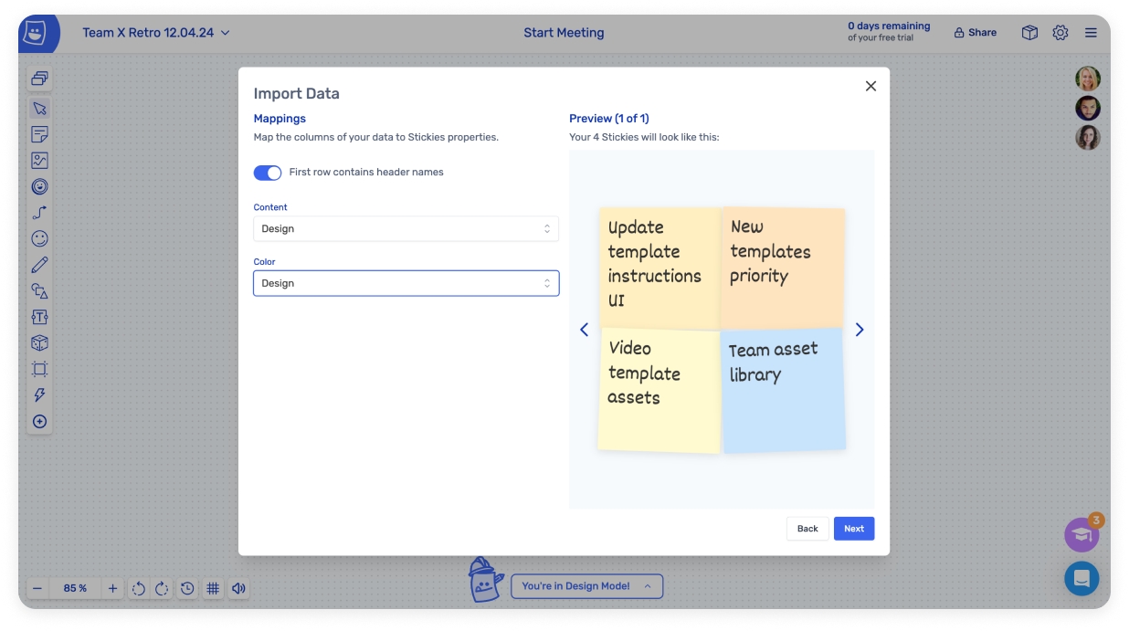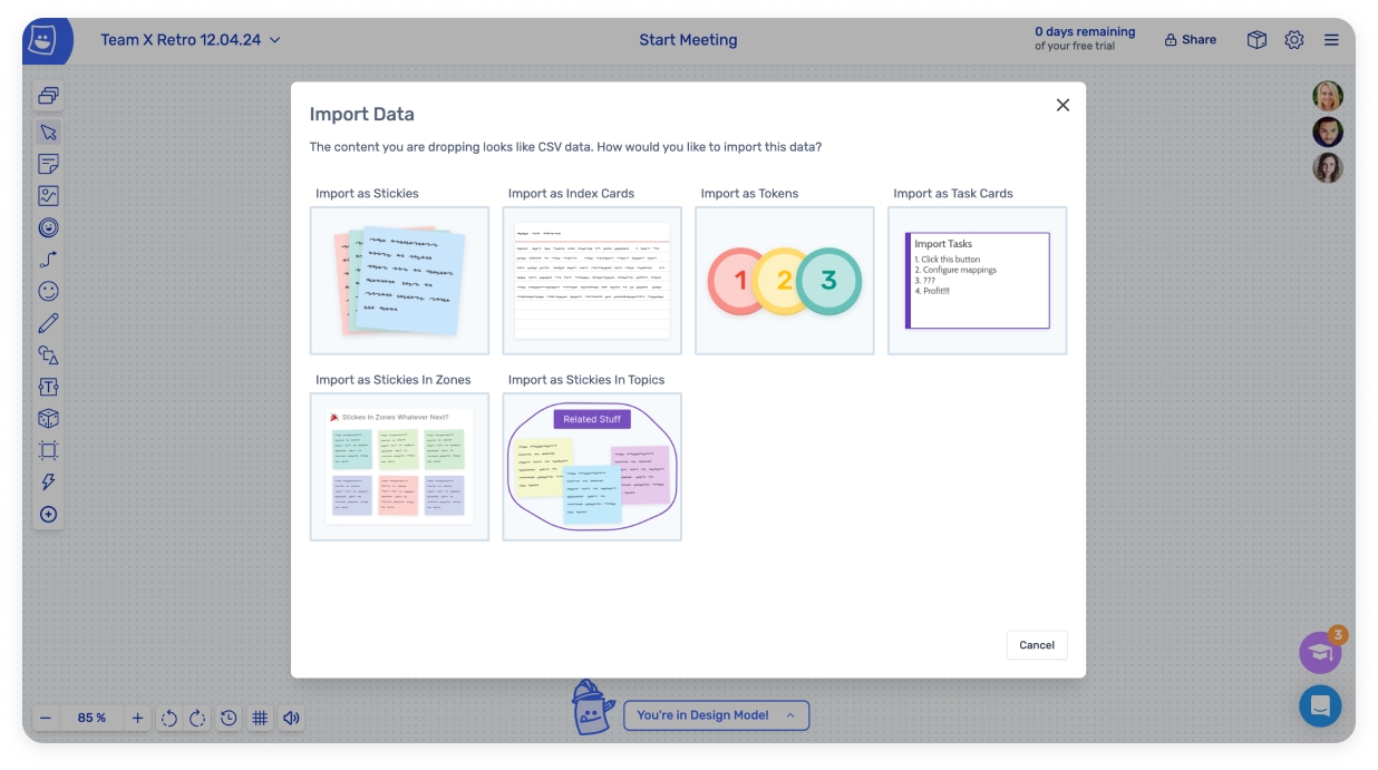 If you want to import structured data to a board, you can drop a .csv file onto a board, paste .csv data or use the Insert option in the Toolbar. You then map the data columns to board elements like stickies, zones, topics, tokens or task cards.