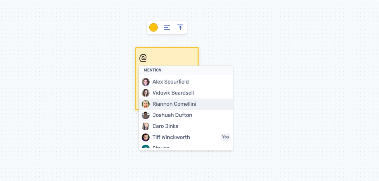To mention someone, simply type @ and continue to type their name, or type @ and select Mention from the options that appear. You can mention multiple people in the same board element.