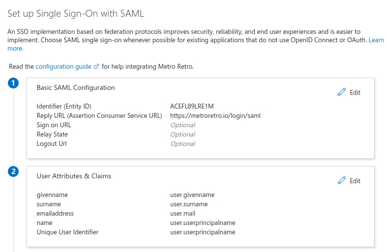 Select Single sign-on from the left menu (or getting started quick link) and select SAML as the sign-in method.