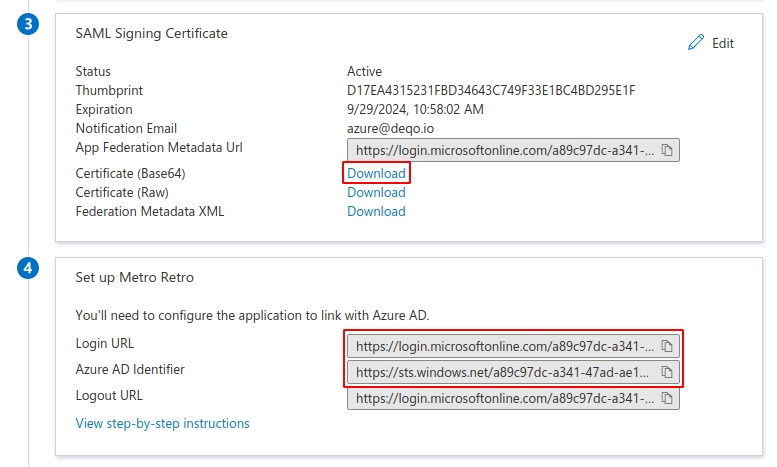 Next, download the Base64 encoded Certificate file from Section 3. Make a note of the Login URL and Azure AD Identifier from Section 4. We will need all these values to configure the Ludi side of the integration.