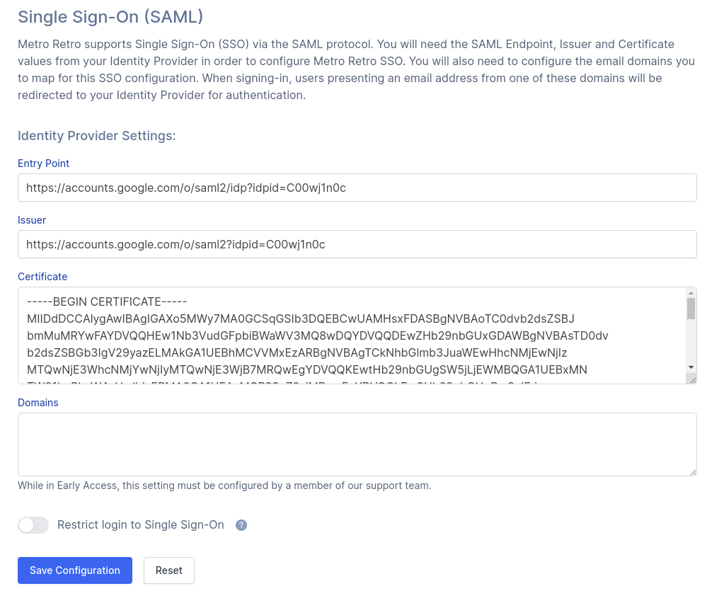 Here we will configure Ludi with the settings it needs to communicate with the Google IDP service. To do this, open a new tab/window in your browser and go to https://ludi.co/manage/security/sso.